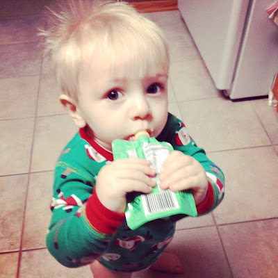 Here's my little guy, at the height of his fussy and painful couple of days. He only wanted squeezable applesauce to eat and we went through lots of it! But how could you say no to those big eyes??